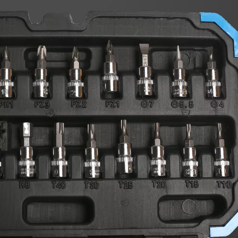 این جعبه شامل سریها و سوکتهای مورد نیاز برای تعمیرات خودرو است. جنس آلیاژ به کار رفته در این مجموعه ابزار کروم-وانادیوم است که طی عملیات حرارتی به دست آمده است و با کروم پوشانیده شده است که استحکام و ضدزنگ بودن آن را تضمین میکند.